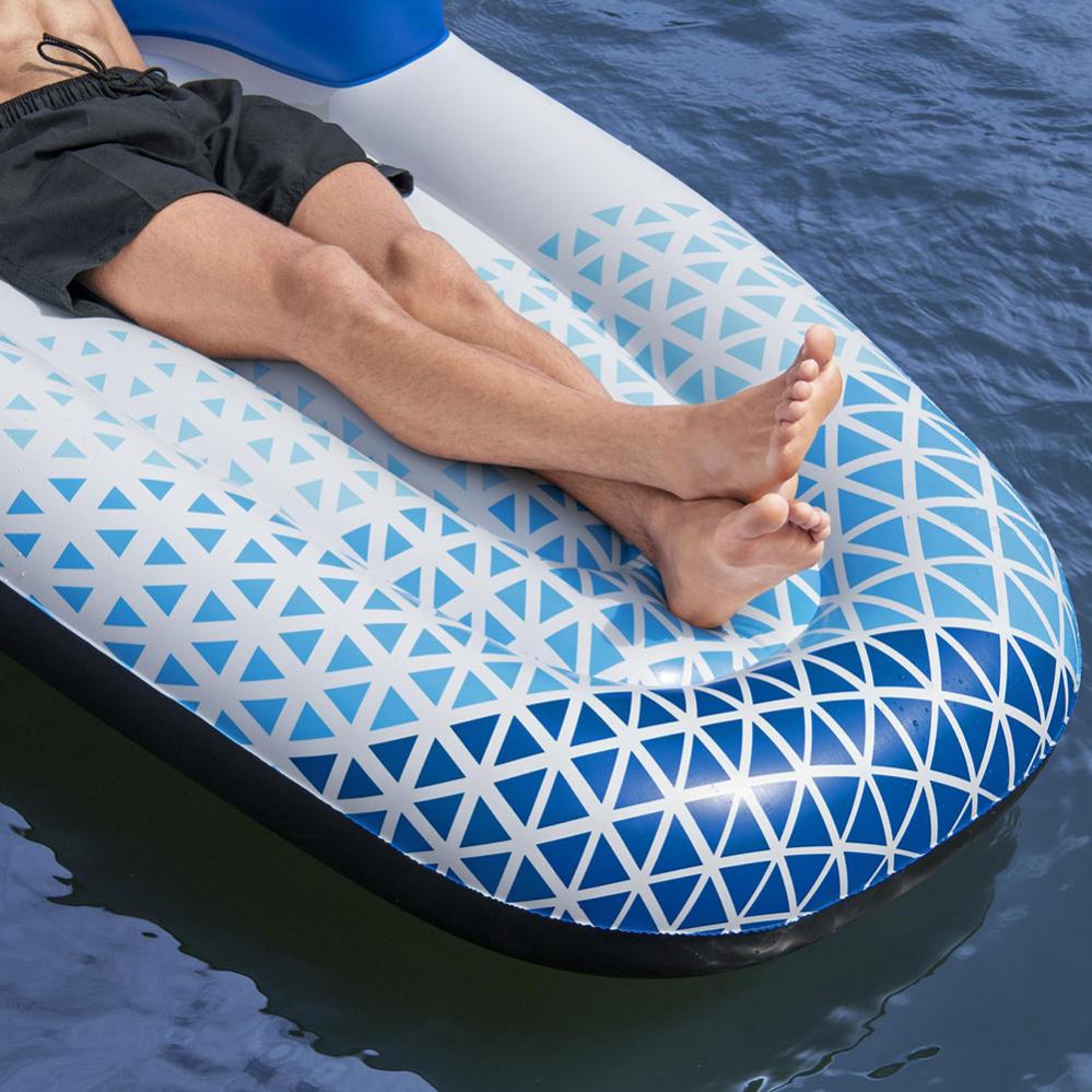 Oppustelig Bademadras Indigo Wave er en hvid- og blåfarvet bademadras i førsteklasses konstruktion med armlæn og hovedstøtte samt en kopholder. Bademadrassen er fremstillet i Inflata-Shield materiale, der modstår punktering, begrænser stræk og forbedrer grebet.