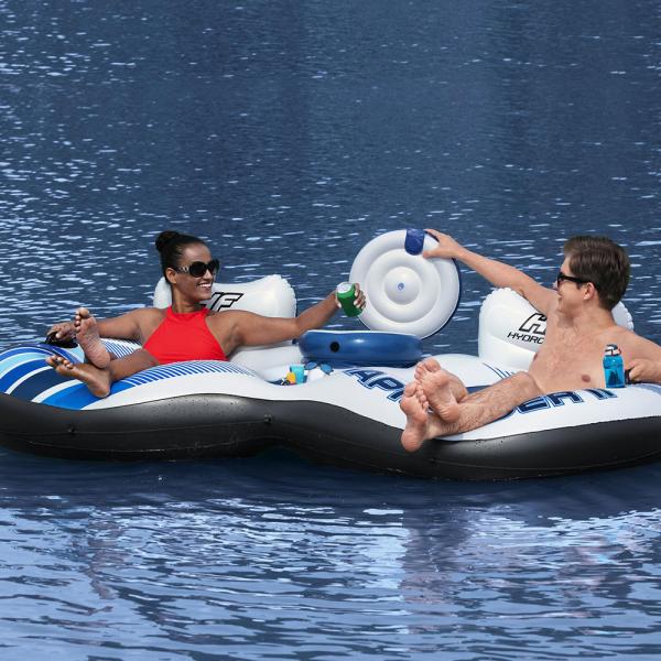 Nyd sommeren med den oppustelige badering Dobbel Rapid Rider II! En stor og komfortabel badering til voksne med en smidig netbund, to kopholdere, oppustelig køletaske og praktisk opbevaringsrum; en perfekt stor svømmering og luftmadras til både afslapning og badning. Tag din favoritperson med og flyd på vandet i stil og komfort med denne oppustelige bademadras.