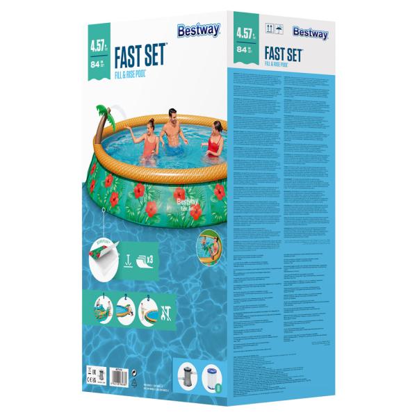 Oppustelig Pool Fast Sæt Paradis Palms omfatter en Fast Set pool fra Bestway med blomstermotiv og en palme, der sprøjter vand, når den er tilsluttet en vandslange. Poolen har en oppustelig top-ring, der rejser sig, mens poolen fyldes med vand. Poolen har en drænventil og punkteringsresistente sidevægge med tre lag. Filterpumpe, der holder vandet rent, samt lappegrej medfølger. Poolen er ca. 84 cm høj og 457 cm bred og rummer ca. 9677 liter.