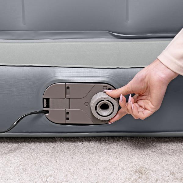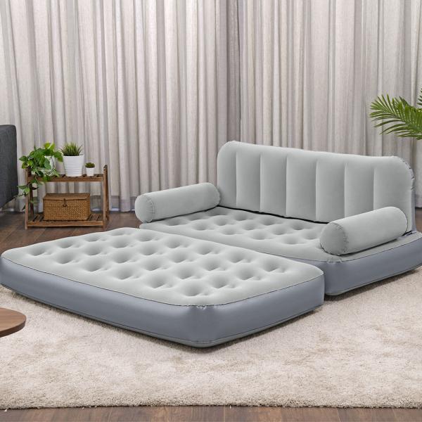 Oppustelig Sofa 3-i-1 Indbygget Luftpumpe Multi-Max er en grå oppustelig sofa med et multifunktionelt design, der kan bruges som sofa eller dobbeltseng. Den har et komfortabelt foldbart design, perfekt til indendørs brug, og har en indbygget 220-240V elektrisk luftpumpe, der puster sofaen op på ca. 3-4 minutter.