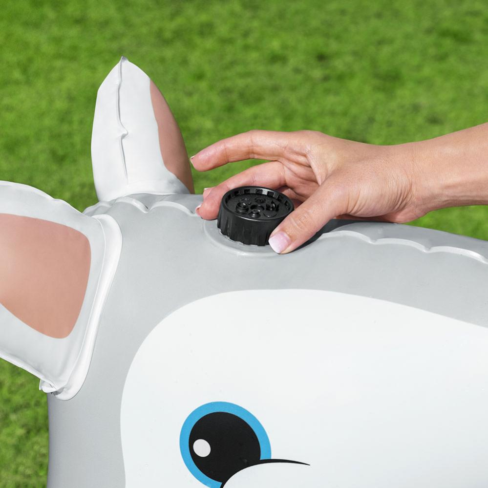 Oppustelig Vandspreder Hund er en oppustelig vandspreder i form af en grå hund, der har en MultiSpray vandspreder på toppen med hele 6 forskellige vandmønstre for sjov vandleg. For øget stabilitet er der en indbygget vandkammer, og vandsprederen tilsluttes nemt til haveslangen.