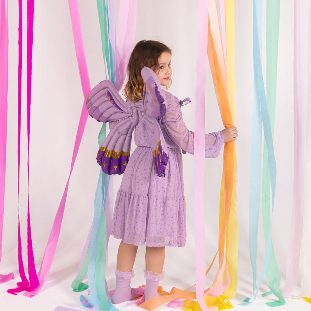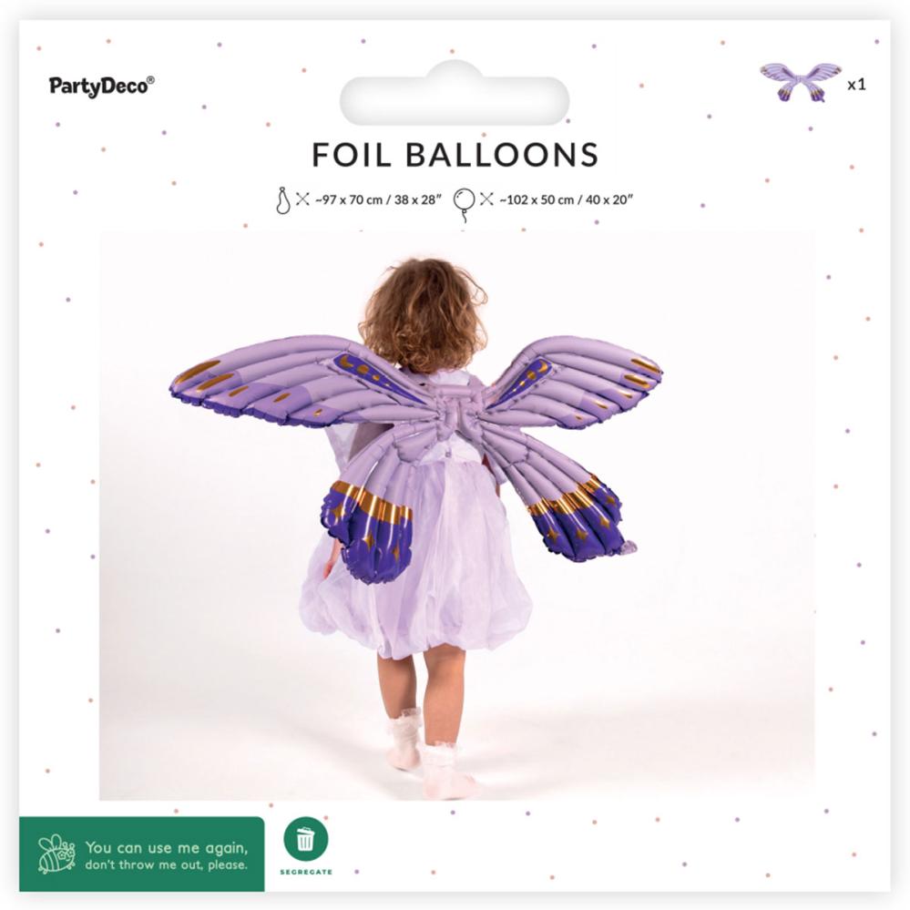 Skab magi til dyrefesten med en oppustelig folieballon formet som sommerfugle-vinger. Den matte lilla farve og de gyldne detaljer giver en eventyrlig følelse. Fastgør den på ryggen eller lad den svæve som dekoration.