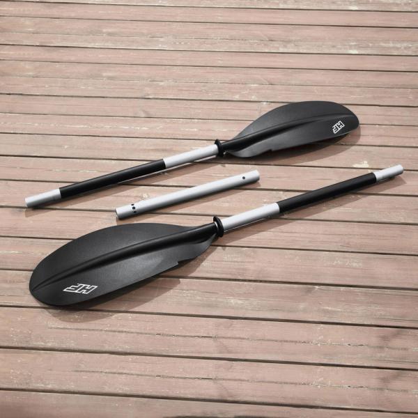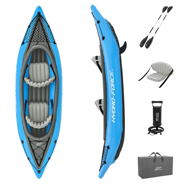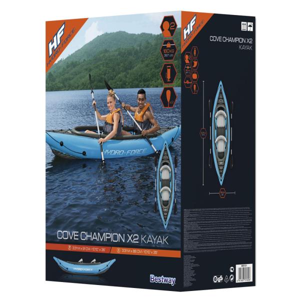 Oppusteligt Kajak Sæt 2 personer inkluderer et sæt med en oppustelig kajak og tilbehør. Hydro Force Cove Champion kajakken fra Bestway er GS-certificeret og passer til 2 personer. Kajakken har en allround-line, aftagelige finner samt sikkerhedsventiler og drænventil, oppustelig bund og sæder. Med kajakken følger to aluminiumspadler på 2,23 meter, en air hammer-håndpumpe samt en lappesæt. Kajakken er lavet i slidstærkt PVC-plast og har en maksimal vægtkapacitet på ca. 180 kg. Kajakken er ca. 3,31 meter lang, 88 cm bred og 45 cm høj.