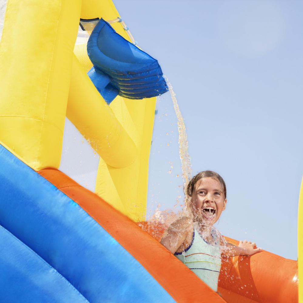 Super sjovt oppusteligt vandland og legepool fyldt med spændende ting som vandkanoner, dobbeltsidet rutsjebane, klatrevæg og sjovt basketballspil. Dette vandlegeområde er perfekt til sommervarmen og passer til børn, der elsker at bade og lege - det er den perfekte vandlegeplads for alle børn, der vil have eventyrlige vandlege.