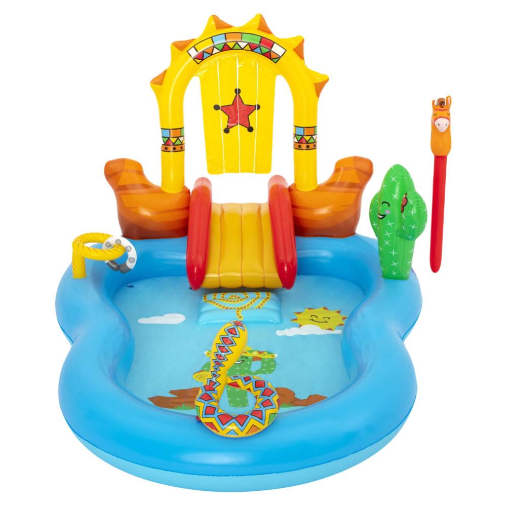 Sjovt vildt vestligt oppusteligt vandland og legepool til at have hjemme i jeres have, perfekt vandlegeplads for alle børn, der ønsker en Bestway børnepool med rutschebane, sprinkler, kastespil og oppustelig stokhest til sjov vandleg. Denne sjove børnebassin og vandlegeplads er fyldt med sjov, en fremragende bade- og plaskepool for alle børn, der ønsker deres egen pool til ekstra sjov leg med vand om sommeren.