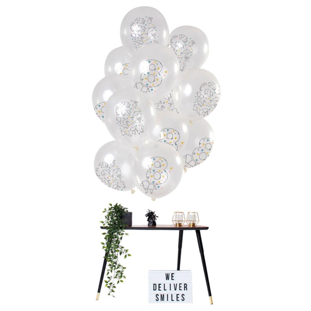 Origami 8-års Balloner indeholder 12 gennemsigtige balloner med motiver af origamidyr, små farverige trekanter samt tallet 8.