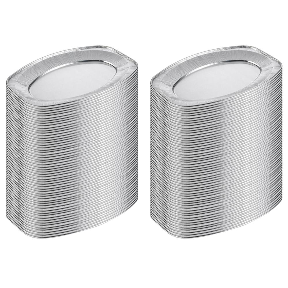 Ovale Serveringsfade Aluminium 100-pak indeholder 100 ovale serveringsfade i sølvfarvet aluminium.