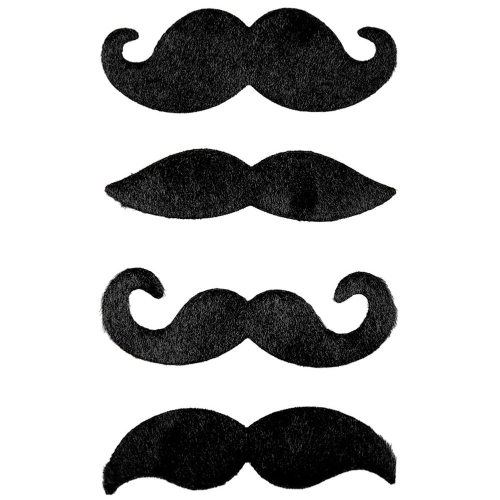 Overskæg Selvklæbende Sort 4-pak består af fire forskellige selvklæbende overskæg i sort.