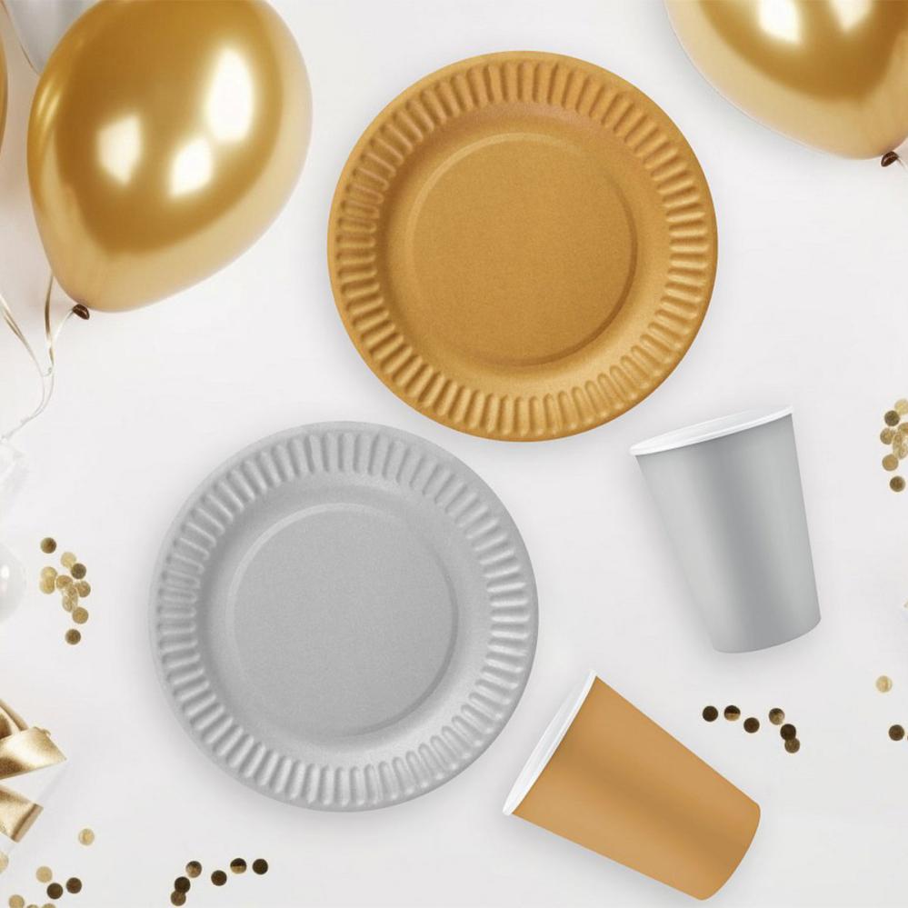 I en juleopdækning giver guld en varm følelse. Ved en opdækning til nytår bidrager festens energi, guld i detaljer og velplacerede assietter til den rette stemning. Engangstallerkenerne i guld gør serveringen lettere. Papirtallerkenerne i guld passer fint til nytår.