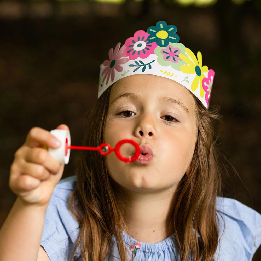 Giv festen et farverigt touch med disse papkroner i lyserød med blomstermotiv. De er justerbare for perfekt pasform og perfekte som festkroner til en fest med blomstertema. De er et festligt indslag blandt dit festtilbehør.