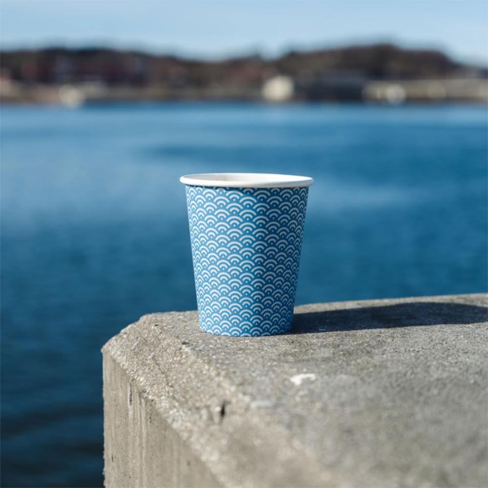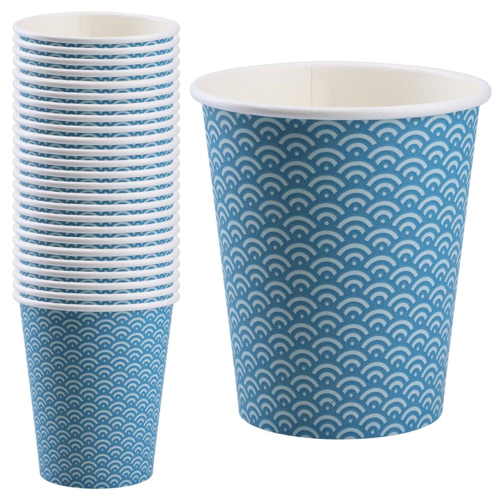 Papkrus Bølger 23 cl 25-pak indeholder 25 engangskrus, dekoreret med et blåt bølgemønster.