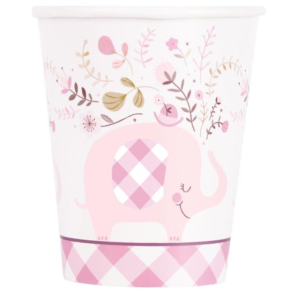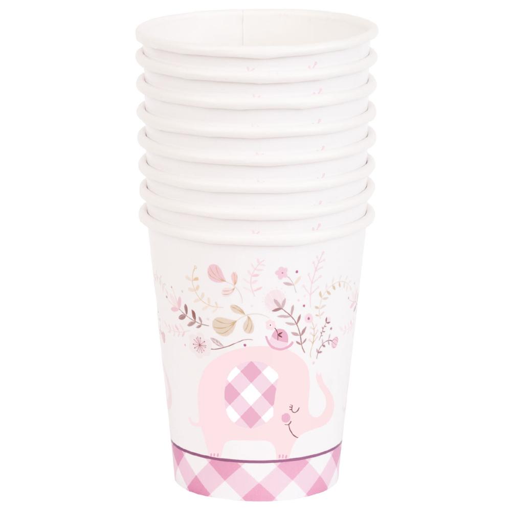 Papkrus Lyserød Elefant 27 cl 8-pak indeholder otte hvide papkrus, dekorerede med planter og en lyserød elefant med hat på ryggen.