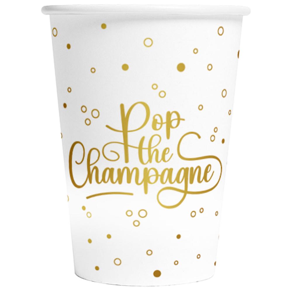 Papkrus Pop the Champagne 8-pak består af otte hvide papkrus med motiv af champagnebobler og teksten "Pop the Champagne" i en dæmpet guldtone.