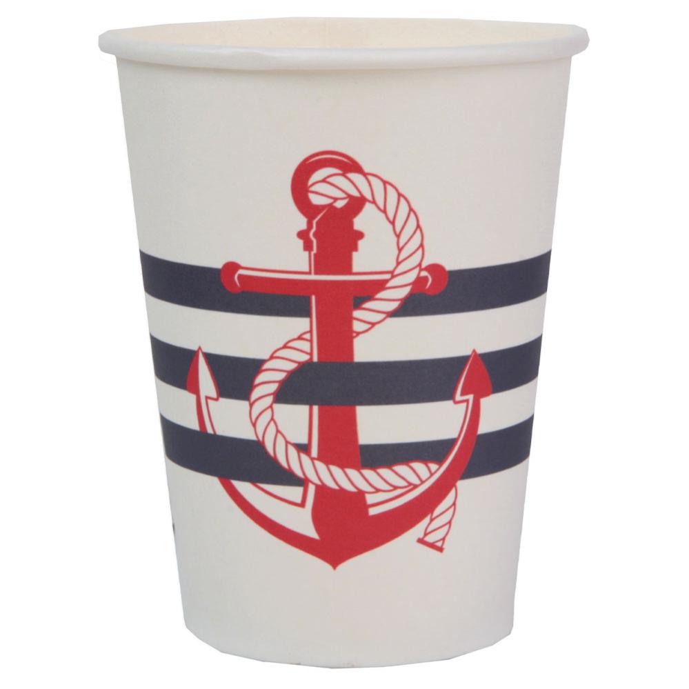 Papkrus Sea Side inkluderer en pakke med 10 hvide engangs-papkrus med mørkeblå striber og rødt anker-motiv. Krusene er lavet af pap og er ca. 9,5 cm høje.