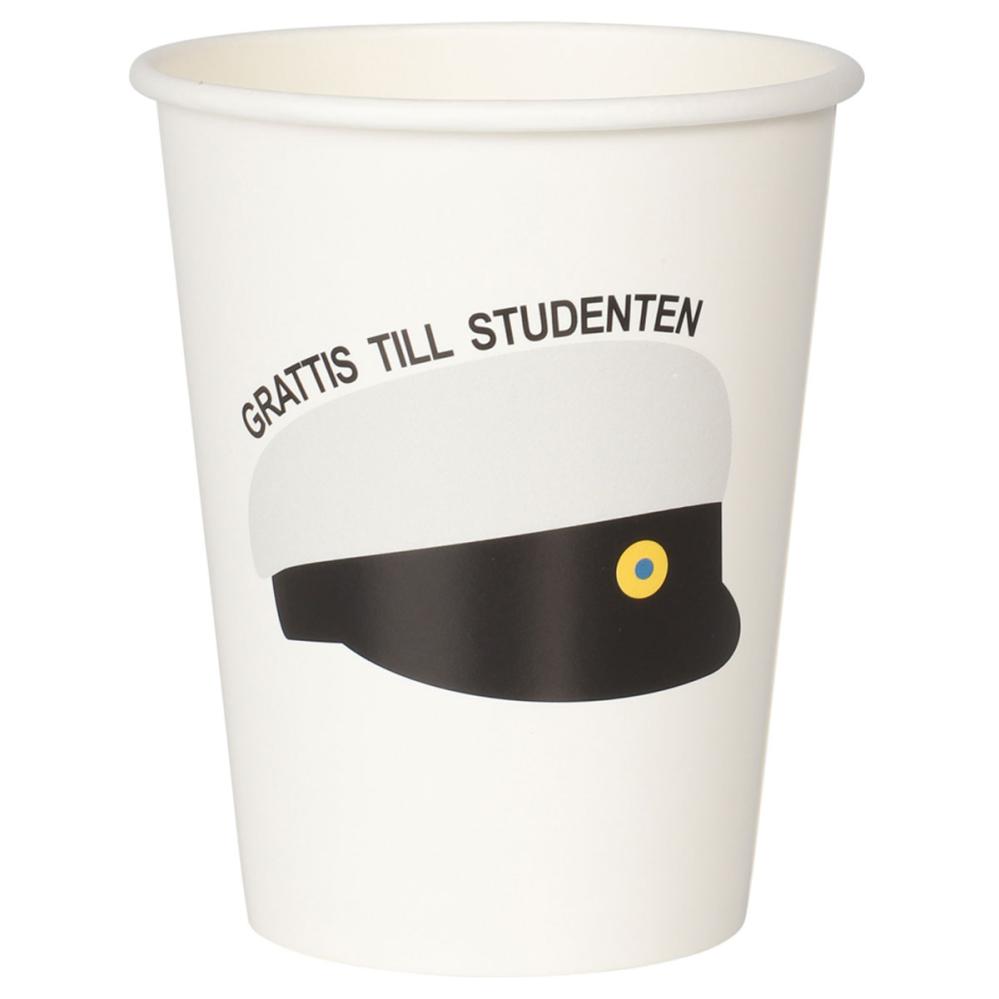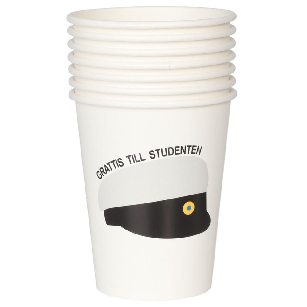 Papkrus Studenterhue 25 cl 8-pak indeholder otte hvide papkrus, dekoreret med teksten "TILLYKKE TIL STUDENTEN" i sort samt en klassisk studenterhue.
