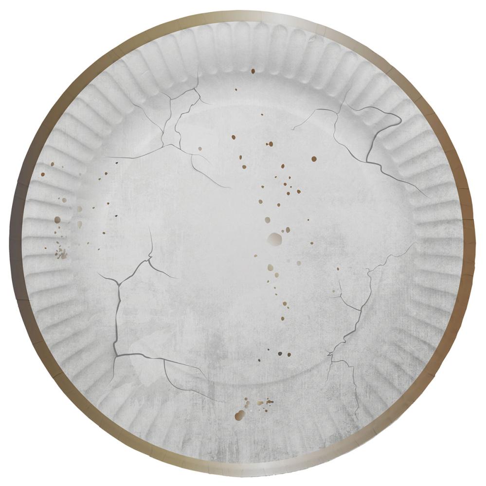 Paptallerkener Creepy Cracks 8-pak omfatter 8 stk. paptallerkener med et sprækket, gråt stendesign med en skinnende guldkant og detaljer.