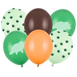 Paptallerkener Dinosaur 6-pak består af seks paptallerkener med dinosaurmotiver. Hver tallerken er dekoreret med en mørkegrøn kant, palmetræer, vulkaner, forskellige dinosaurer og andre detaljer i nuancer af grøn og brun mod en hvid baggrund.
