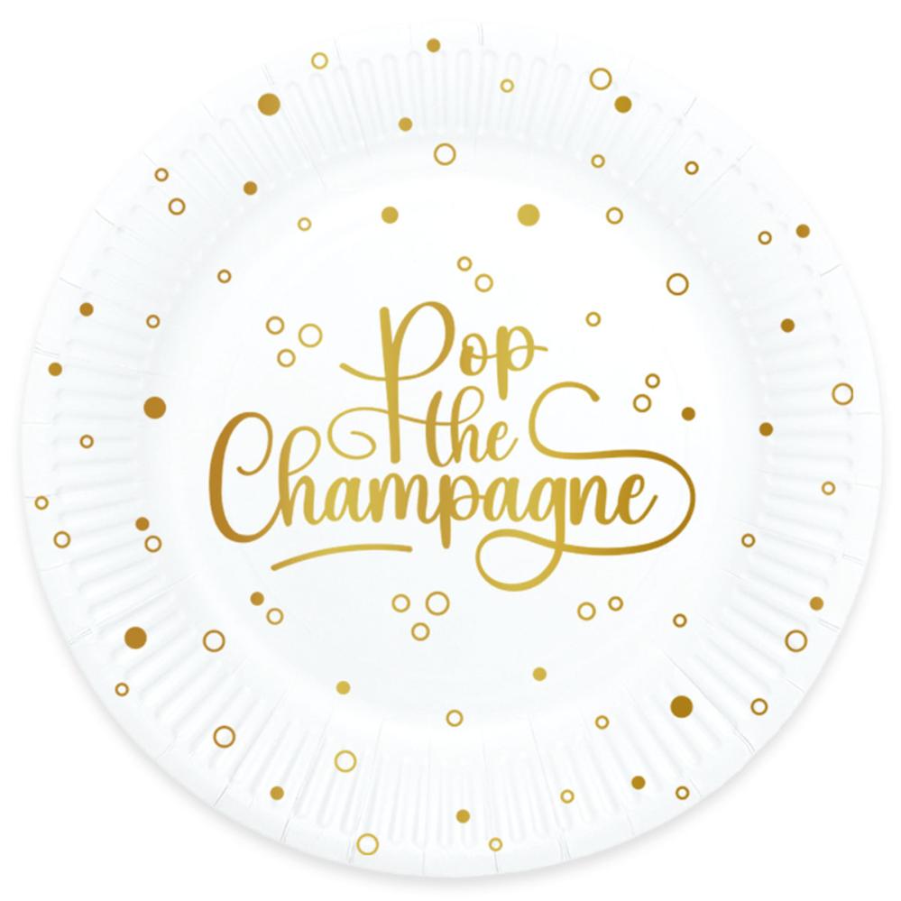 Paptallerkener Pop the Champagne 8-pak består af otte hvide paptallerkener som har motiv af champagnebobler og teksten "Pop the Champagne" i en dæmpet guldtone.