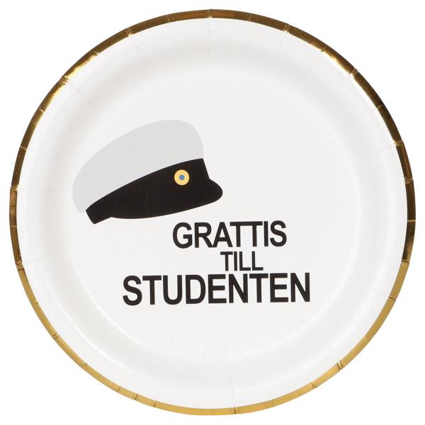 Paptallerkener Studenterhue 23 cm 8-pak indeholder otte hvide paptallerkener med guldkant og er dekoreret med teksten "TILLYKKE TIL STUDENTEN" i sort samt en klassisk studenterhue.