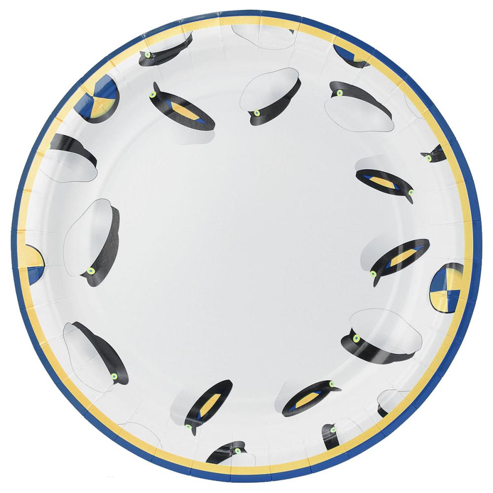 Paptallerkener Studenterhuer 8-pak består af otte hvide engangstallerkener dekoreret med en blågul kant og motiv af studenterhuer.