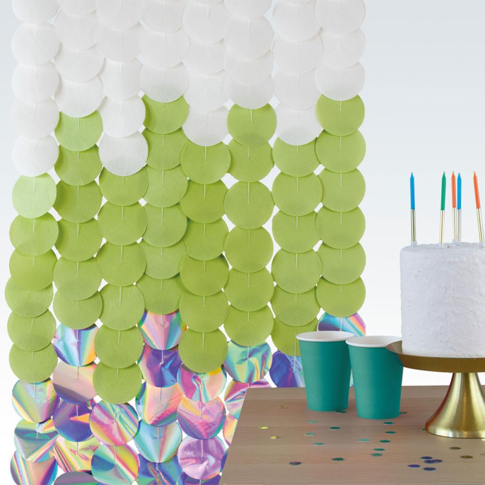 Skab en personlig og glitrende partydekoration i form af en baggrund med dette cirkelformede gardin i hvid, lysegrøn og iriserende nuancer. Dette er en fleksibel backdropdekoration med otte guirlander, som løfter enhver festdekoration til næste niveau.