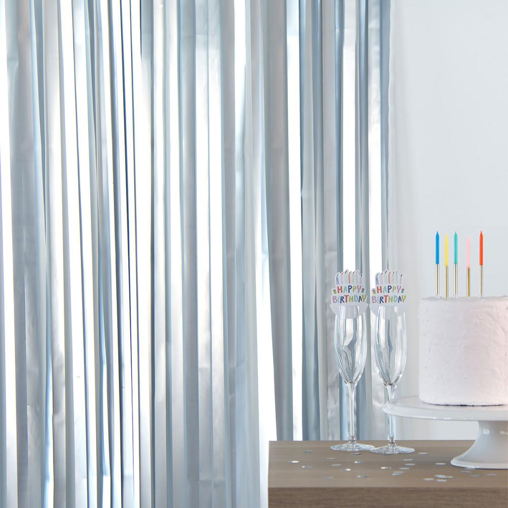 Skab feststemning med det samme med et partyforhæng i mat sølv. Det elegante dørforhæng med lange strimler fungerer perfekt som dørgardin og giver entréen til festen et legende og stilrent løft.