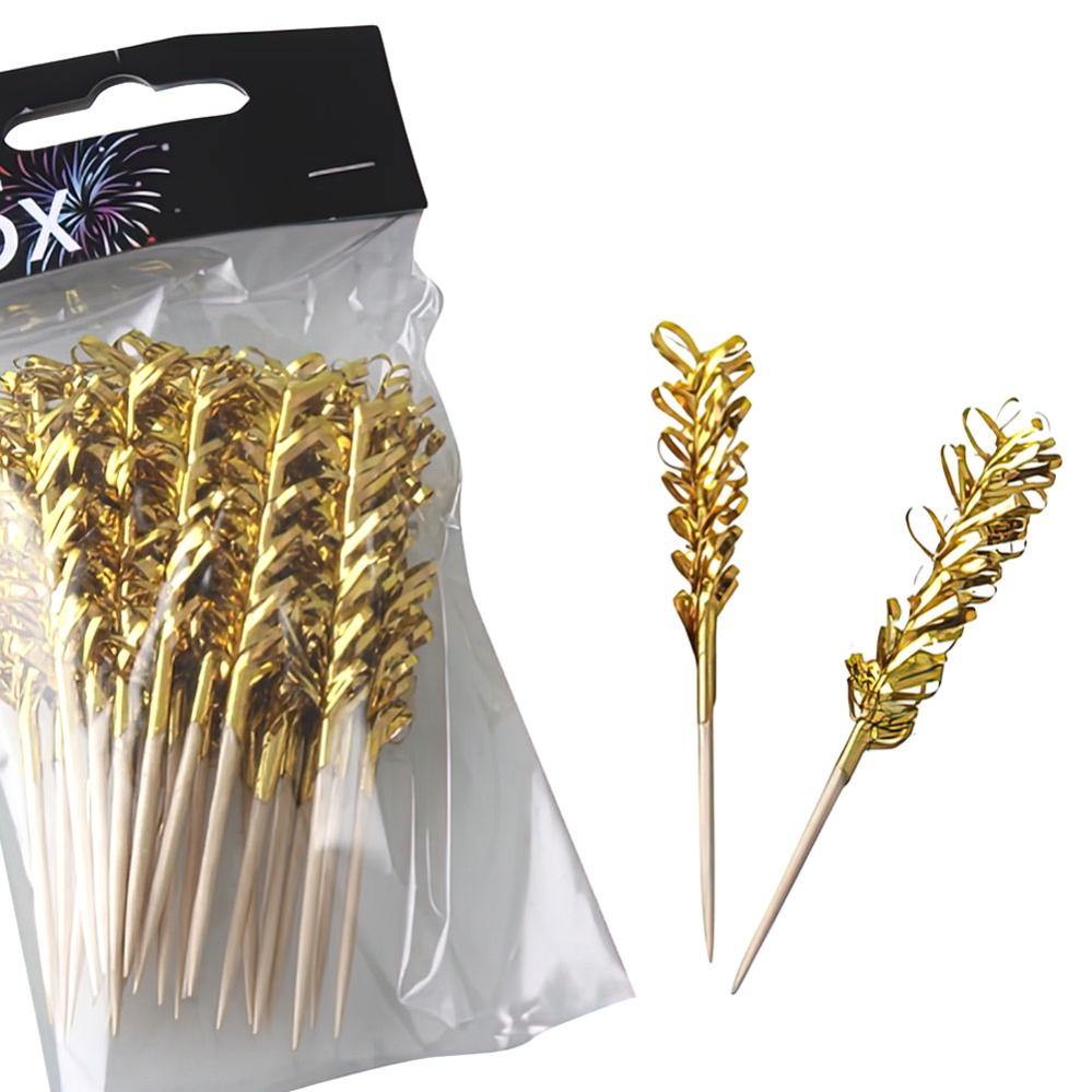 Party Picks med Guld Dekorationer inkluderer 25 cocktailpinde i træ med gyldne kruseduller i folie. Cocktailpindene er ca. 8 cm lange.