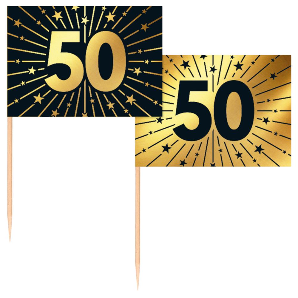 Partypicks 50 år Guld/Sort 50-pak består af halvtreds træpinde med flag, prydet af et elegant guld og sortfarvet motiv med strålende linjer, stjerner og tallet 50. Halvdelen af partypindene har et gyldent motiv mod en sort baggrund, mens den anden halvdel har et sort motiv mod en gylden baggrund.