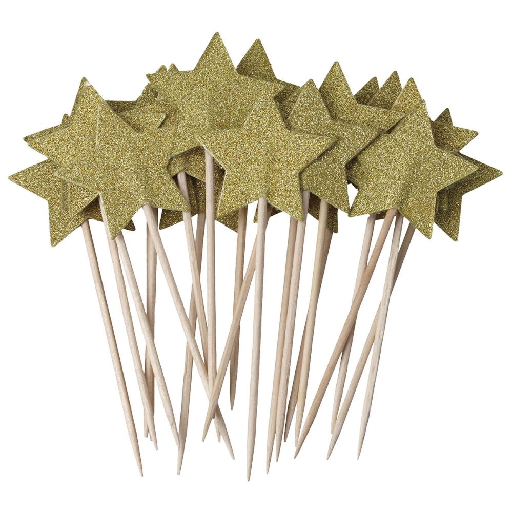 Partypicks Guldstjerner med Glitter 20-pak indeholder tyve partypinde med guldfarvede stjerner med glitter.