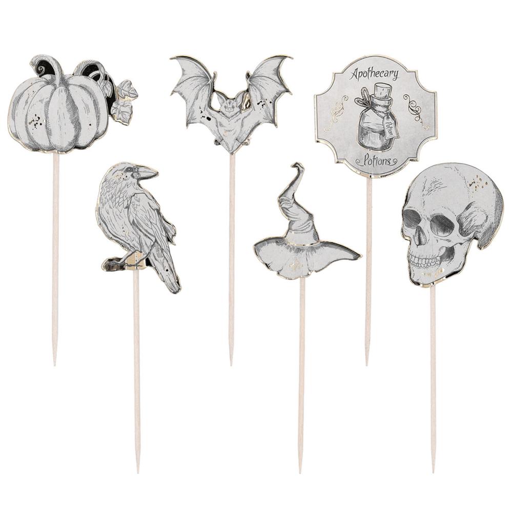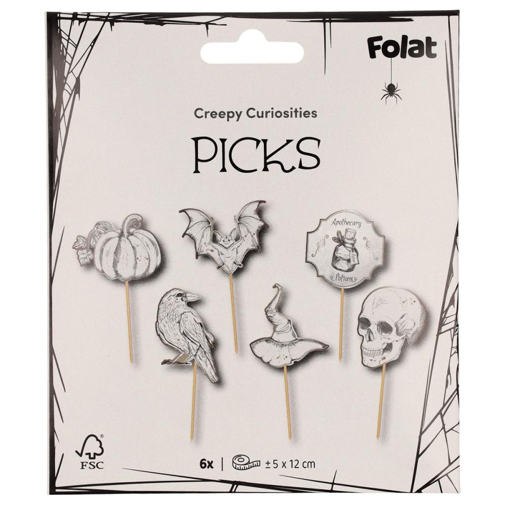 Partypicks Halloween 6-pak består af 6 styk partypicks med én af hver af følgende dekorative figurer: et græskar, en ravn, en flagermus, en heksehat, en heksedrik og et dødningehoved. Motiverne er trykt på begge sider og har skinnende gulddetaljer.
