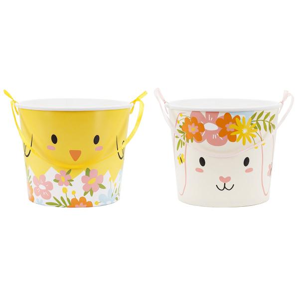 Påske-spand med Håndtag 17x14 cm 2-pak består af to påskespande, en hvid med rosa satinbånd og en gul med matchende satinbånd, dekoreret med forskellige dyremotiver og blomster.