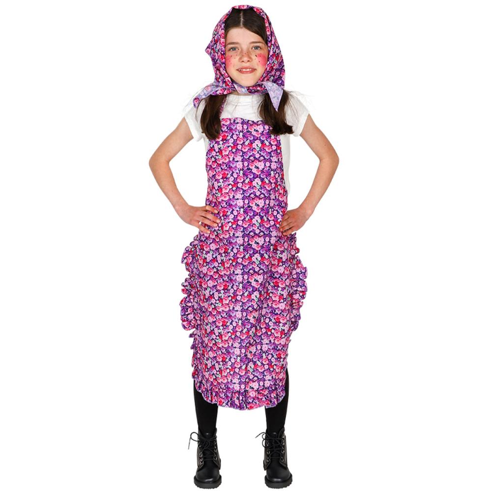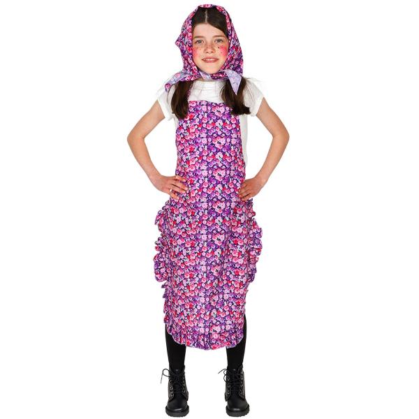 Påskeheks Blomstret Børnedragt 128/140 cm omfatter en børnedragt med et forklæde og et tørklæde med blomstermønster i lilla, rosa og rødt.