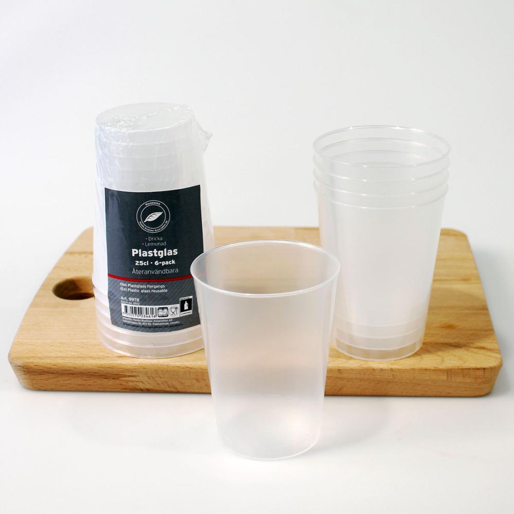 Pastikglas 25 cl 6-pak indeholder seks transparente plastglas, som er genanvendelige.