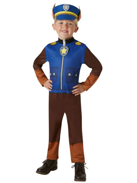 Paw Patrol Chase Kostume til Børn er en blå og brun jumpsuit med trykt politi-vest. Der medfølger også en hat med fastsyede ører.