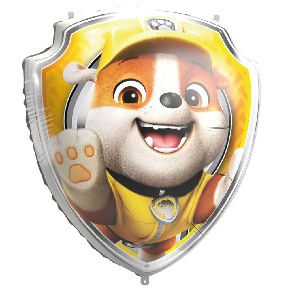 Paw Patrol Folieballon Rubble 75 cm omfatter en folieballon med motiv af karakteren Rubble fra tv-serien Paw Patrol. Der medfølger både et sugerør til nem manuel oppustning og en snor til brug ved heliumfyldning.