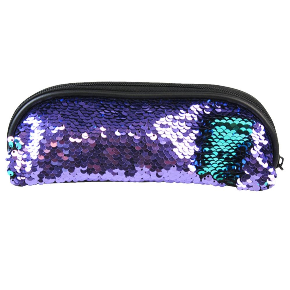 Penalhus Pailletter Lilla omfatter et penalhus med lilla pailletter og en lynlås.
