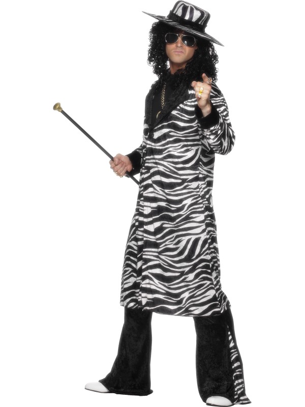 Pimp Kostume Sort/Hvid Kostume inkluderer en zebramønstret jakke med fløjlskanter og et matchende par bukser med udsvingede ben. Derudover medfølger en pimphat.