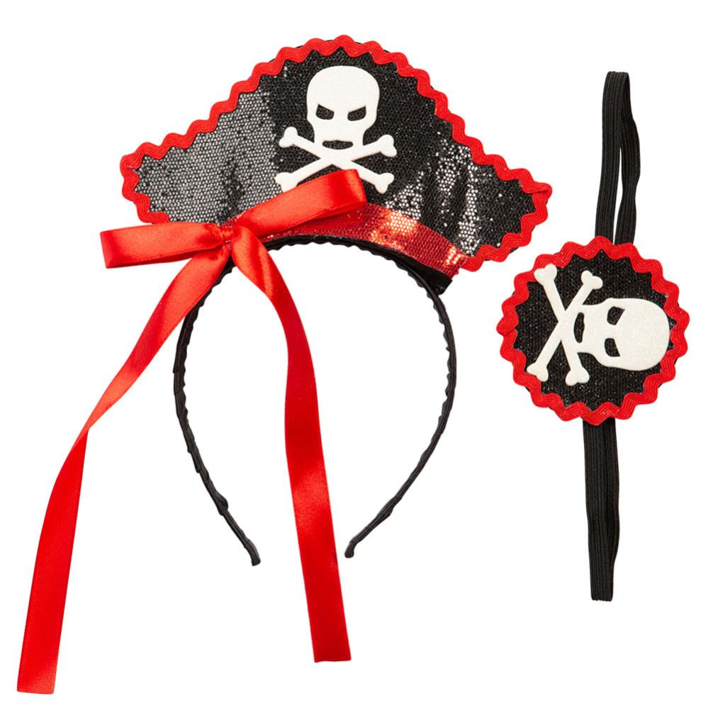 Pirat Hårbøjle og Klap for Øjet inkluderer en sort hårbøjle med en top, der ligner en pirathat i glitrende rød, sort og hvid samt en rød sløjfe. Der medfølger også en klap for øjet med en rød kant, glitrende sort baggrund og en glitrende hvid dødningehoved.