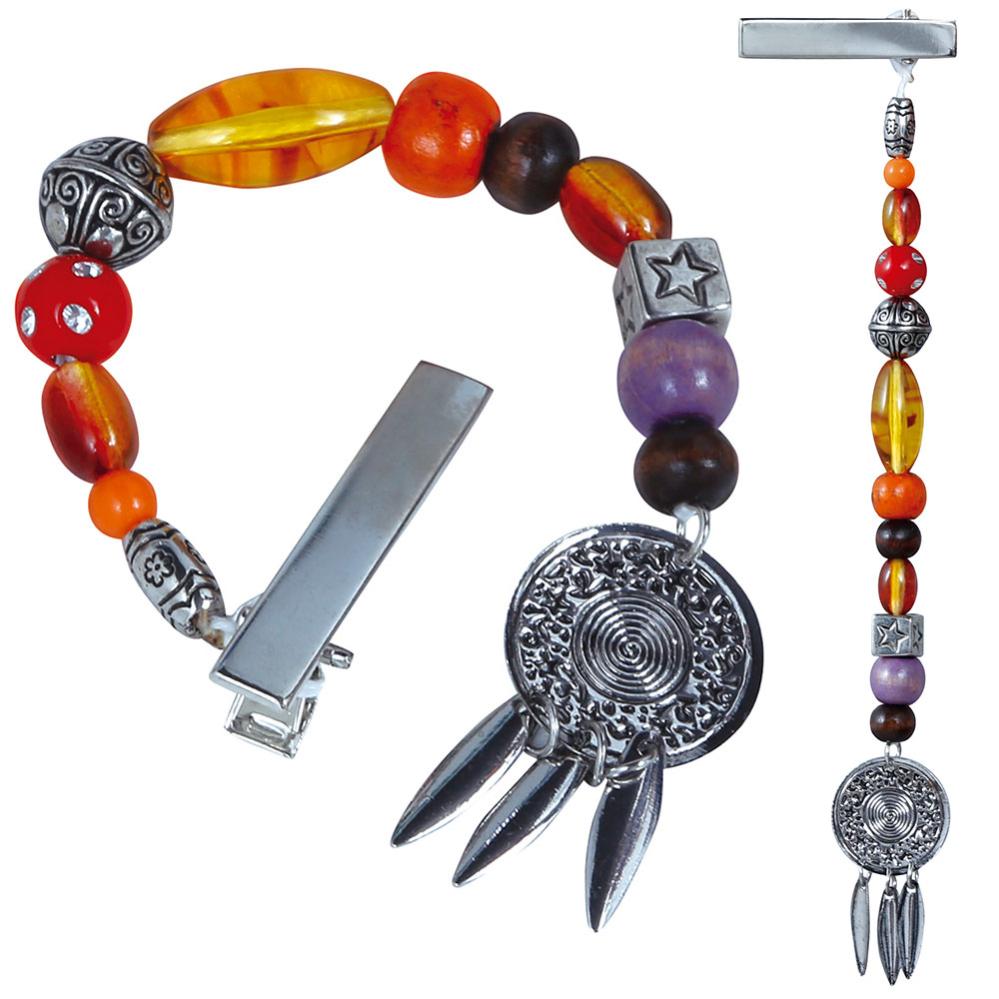 Pirat Hårspænde omfatter et hårspænde med røde, orange, sorte, lilla og sølvfarvede perler.