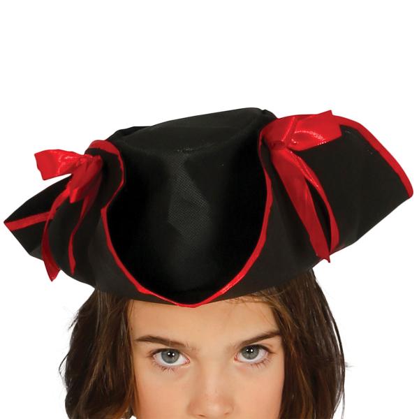 Pirat Kostume Børn omfatter et pirat kostume med en pirathat i sort og rød, et par sorte bukser, et taljebånd med et sølvfarvet spænde og en hvid bluse med en fastsyet rød jakke, dekoreret med hvide dødningehoveder og sorte kanter.