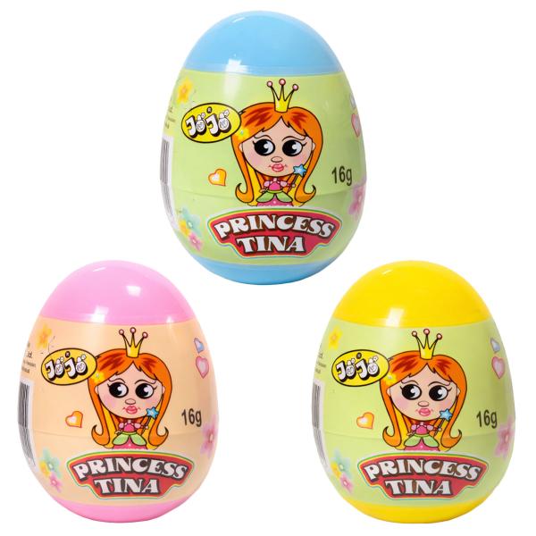 Prinsesse Overraskelsesæg 16 g er et plastæg med sejt og poppende slik samt en overraskelsesgave med motiv af en prinsesse. Ægget findes i farverne gul, lyserød eller blå.