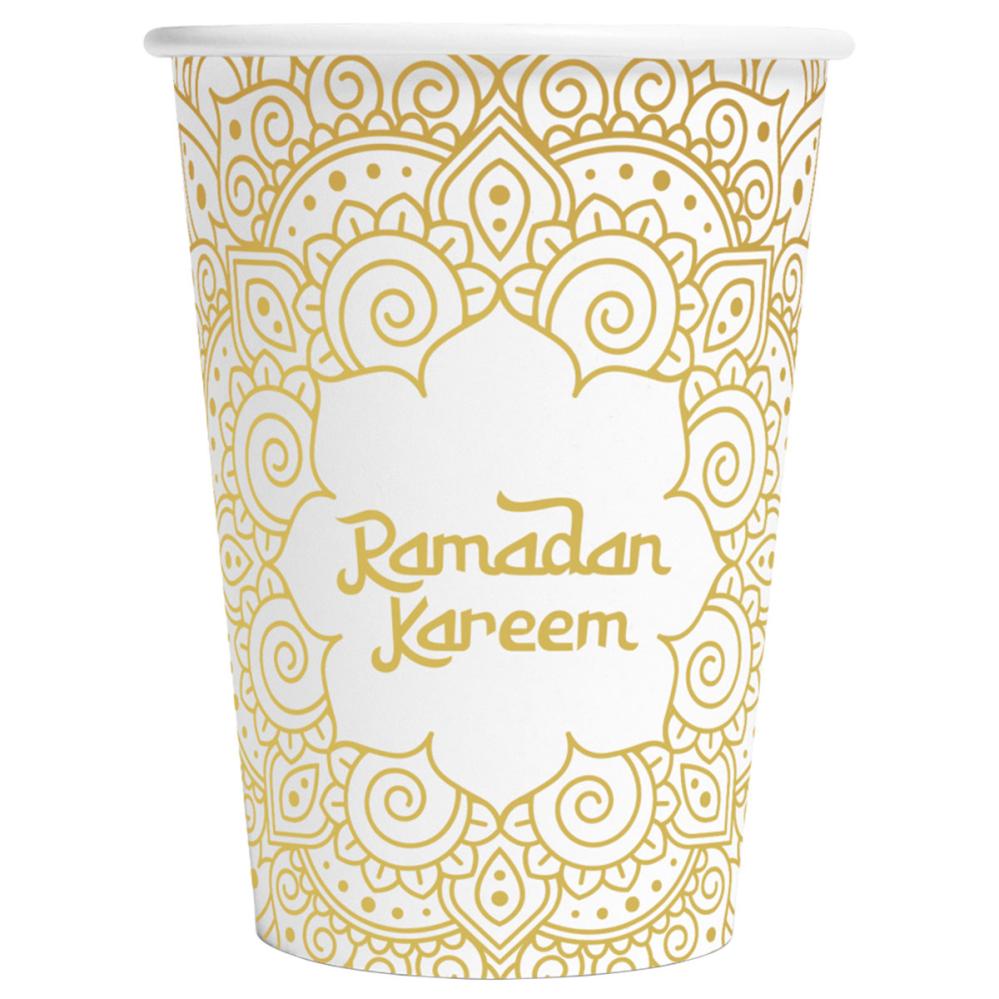 Ramadan Kareem Papkrus 21 cl 8-pak indeholder otte hvide engangskrus, som er prydet med et smukt mønster og teksten "Ramadan Kareem" i mat guld.