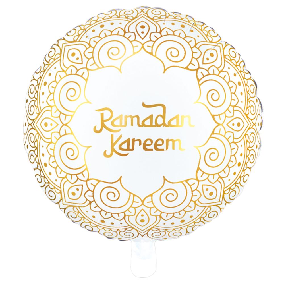 Ramadan Kareem Rund Folieballon 46 cm omfatter en rund, hvid folieballon med et skinnende guldfarvet mønster og teksten "Ramadan Kareem".