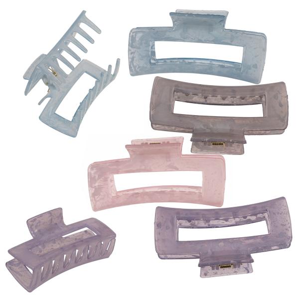 Rektangulær Hårklemme Marmor 10 cm er en rektangulær hårklemme med en let gennemsigtig overflade og et marmoreret mønster. Hårklemmen fås i fire forskellige farver.