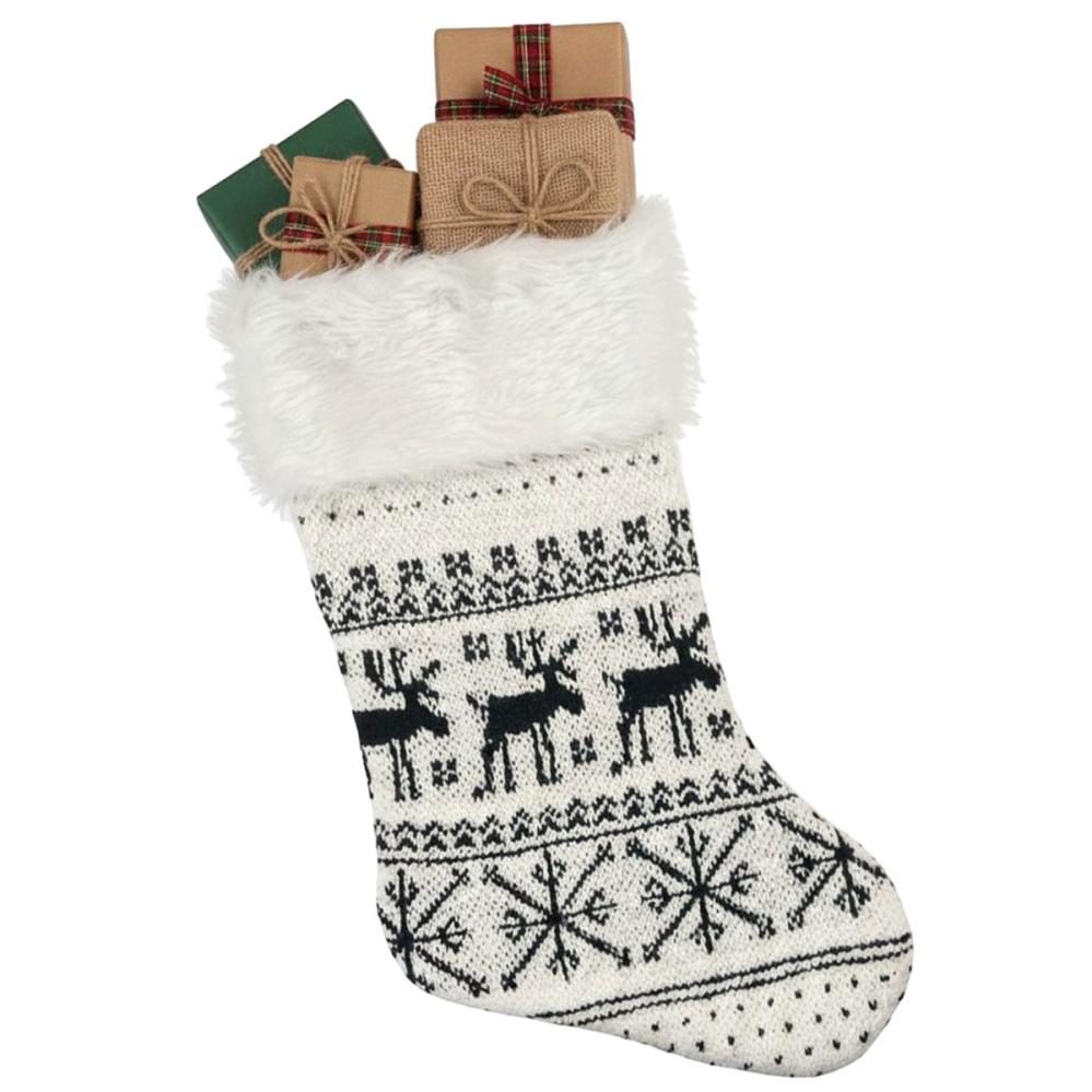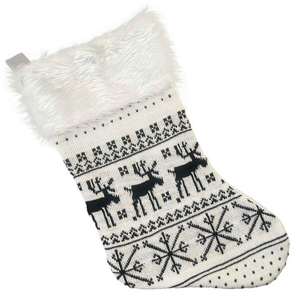 Rensdyr Julestrømpe Sort/Hvid omfatter en hvid julestrømpe med pelskant, dekoreret med snefnug, rensdyr og andre sorte detaljer. Julestrømpen har en hvid løkke til ophængning.