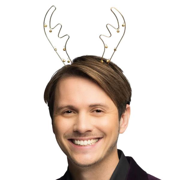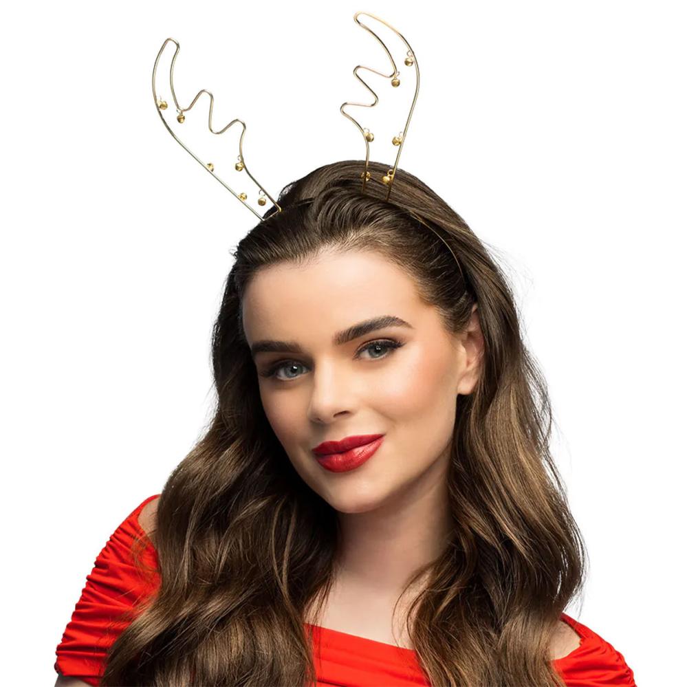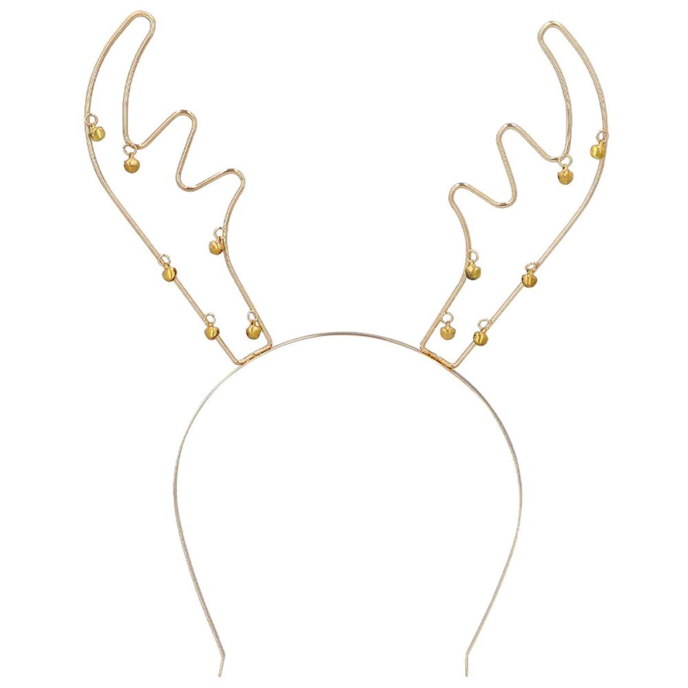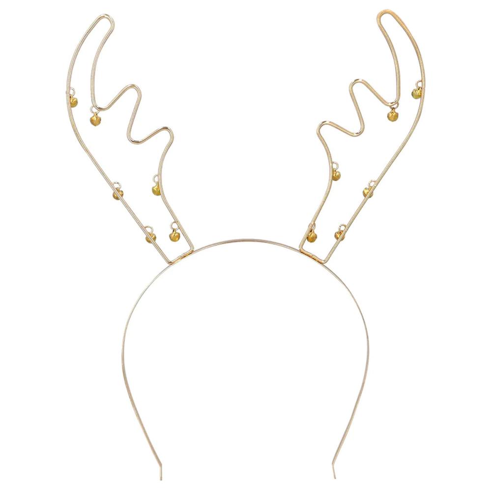 Rensdyrhorn Julehårbøjle med Klokker Guld omfatter en guldfarvet hårbøjle med rensdyrhorn og klokker.
