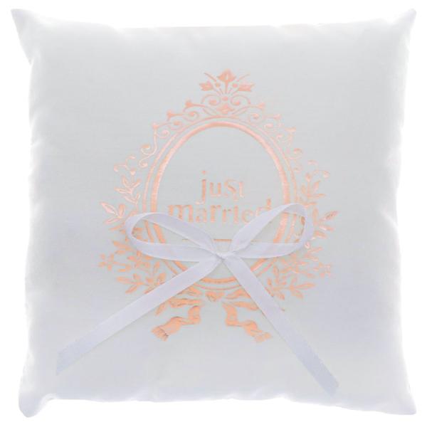 Ringpude Just Married Rosaguld omfatter en hvid ringpude med hvid sløjfe og roseguld Just Married tekst med matchende mønster. Puden er lavet af polyester og bomuld og måler ca. 18 x 18 cm.