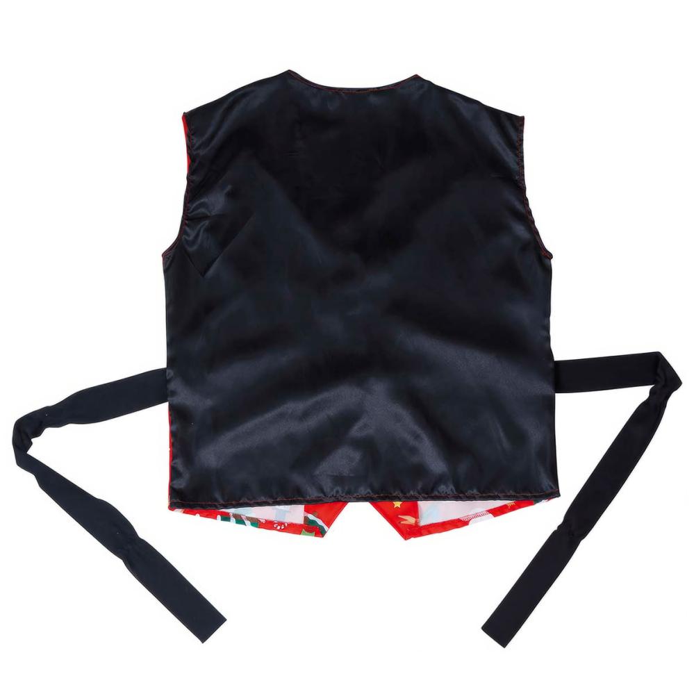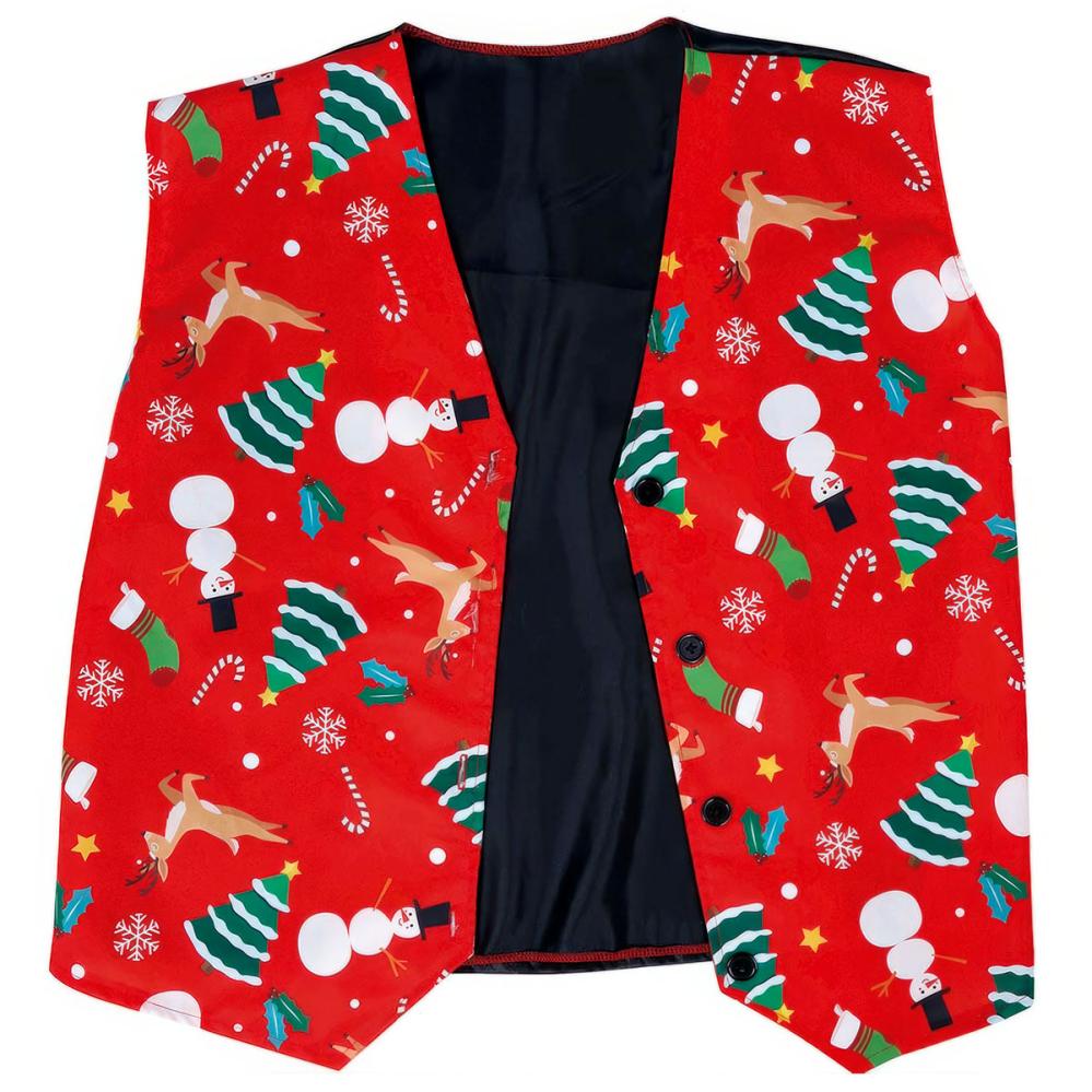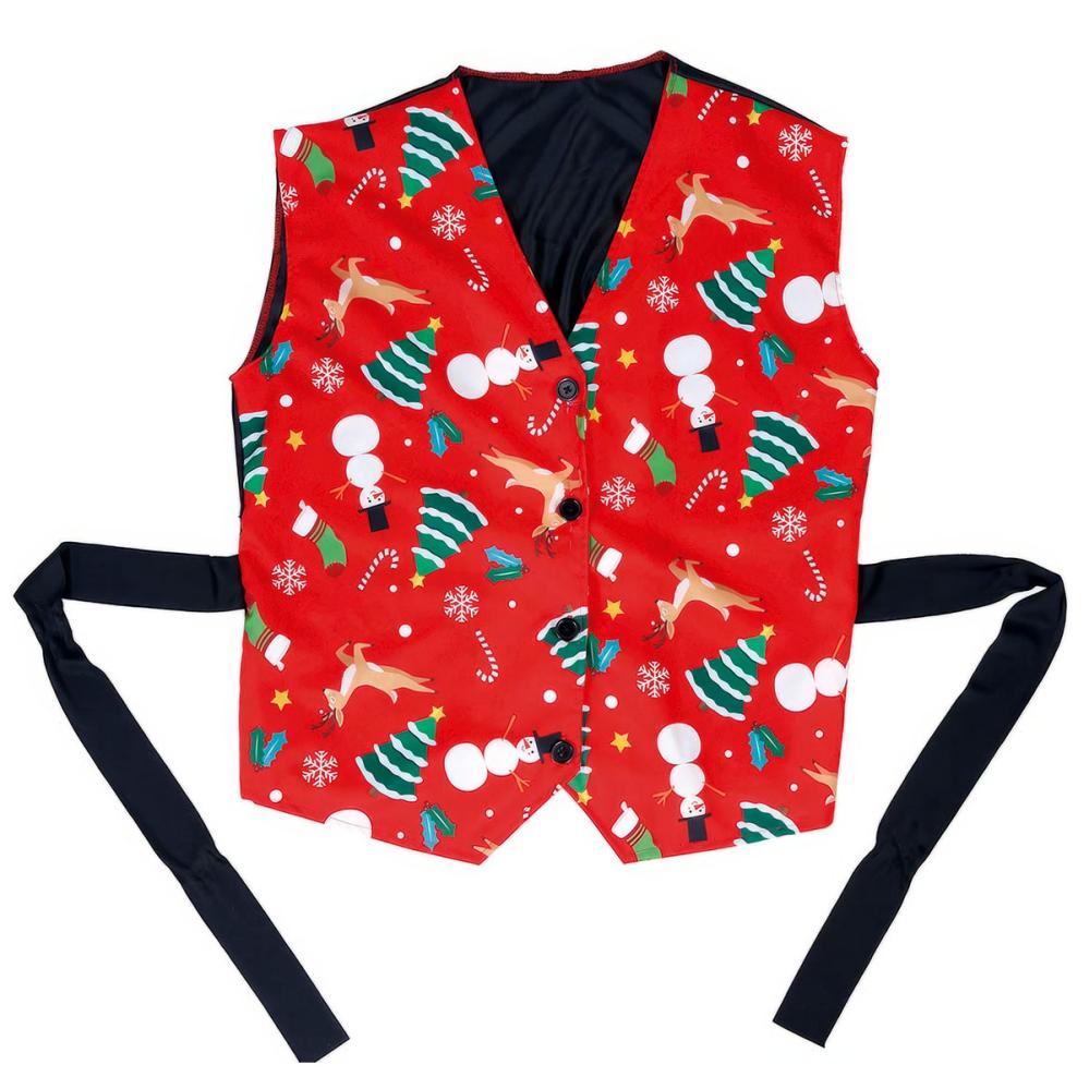 Rød Julevest omfatter en rød vest med julemotiv, sorte knapper foran og et justerbart sort rygbånd for bedre pasform. Vesten prydes af juletræer, julerensdyr, snemænd, julestrømper, polkagrise med mere. Bemærk at kun vesten medfølger, butterfly følger ikke med.