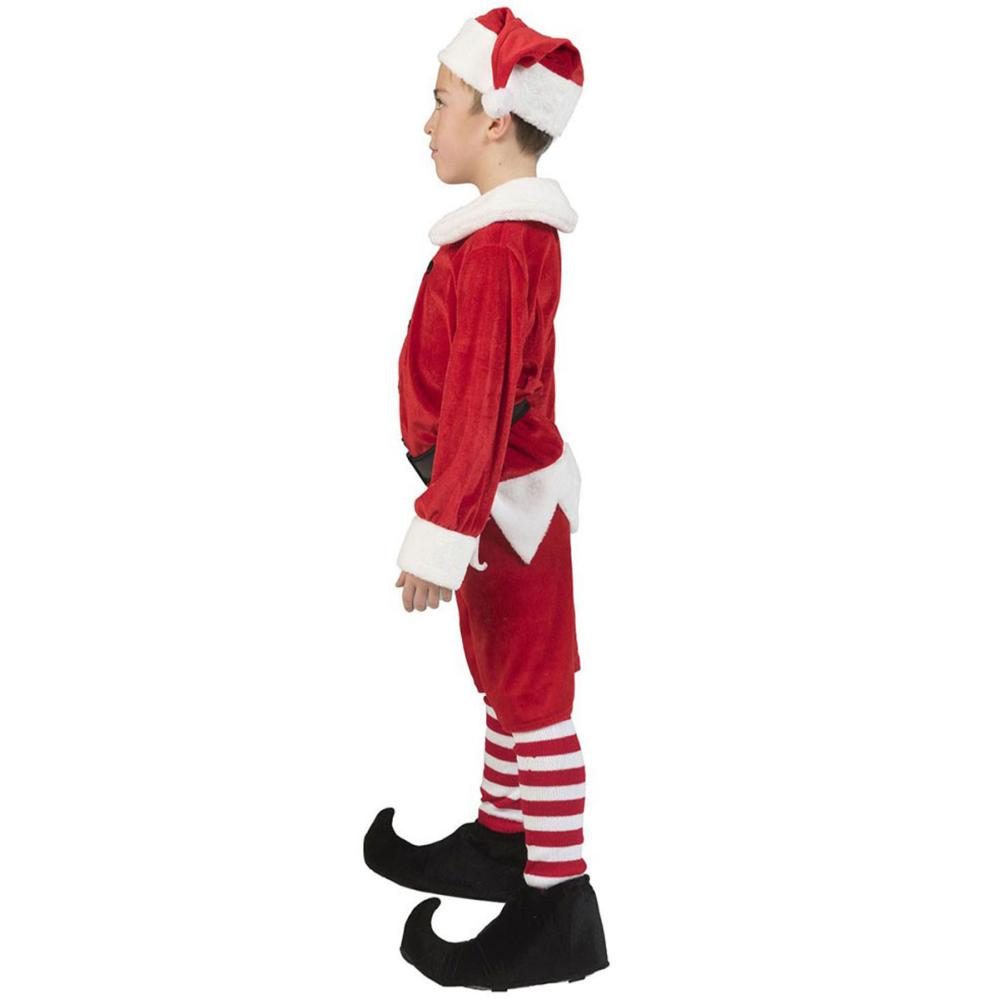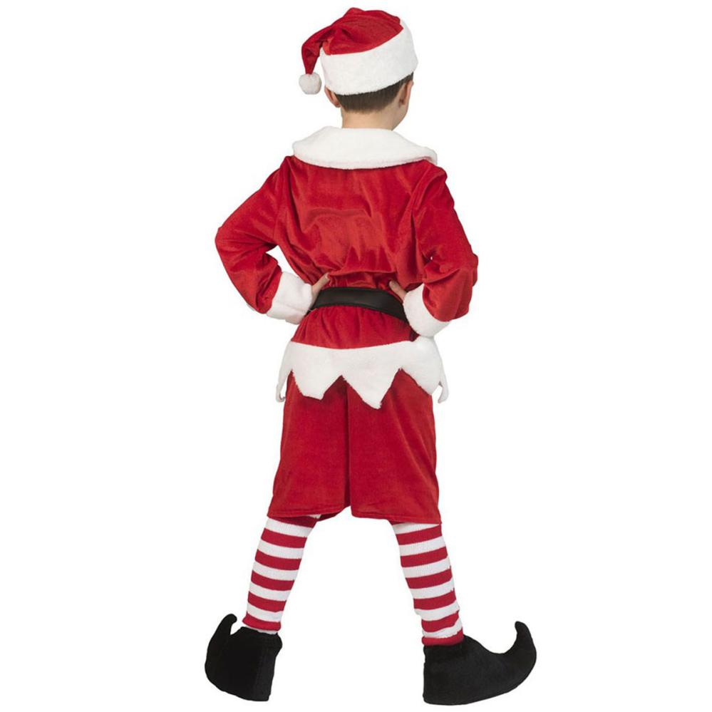 Rød Nissekostume til Børn omfatter et nissekostume i rødt og hvidt med en nissehue, et par shorts, et sort bælte og en jakke med hvid krave, sorte knapper foran og takkede hvide kanter.