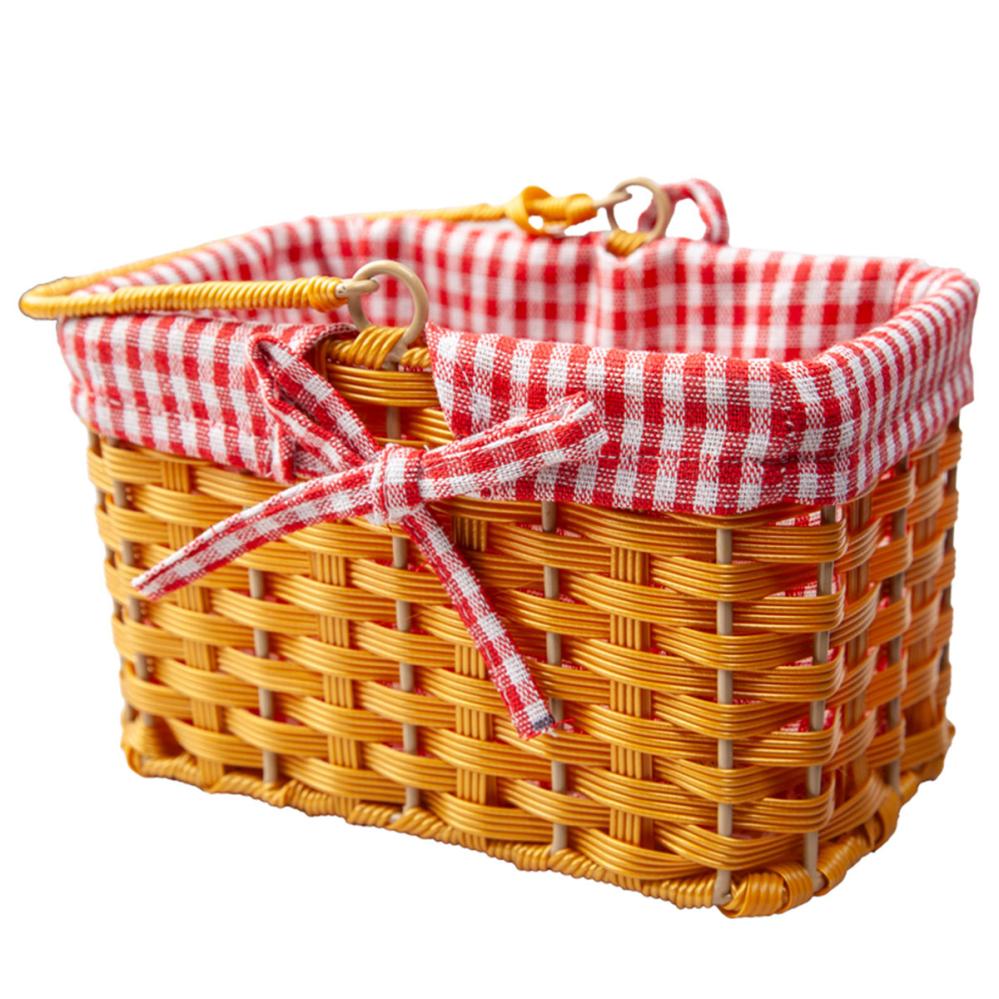 Rødhættes Kurv er en charmerende flettet picnickurv i gul nuance, prydet med en rød- og hvidternet dug og praktisk hank, inspireret af eventyret om Rødhætte.